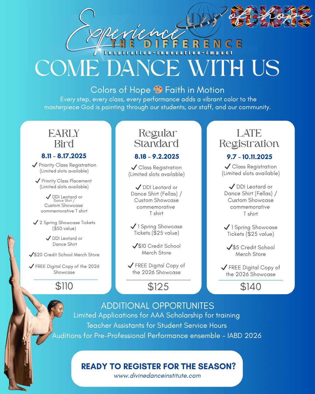 Welcome to Divine Dance Institute – affectionately known as DDI! We are happy that you are considering this educational institution as the vehicle that will help propel you into your next level of service through dance and art.